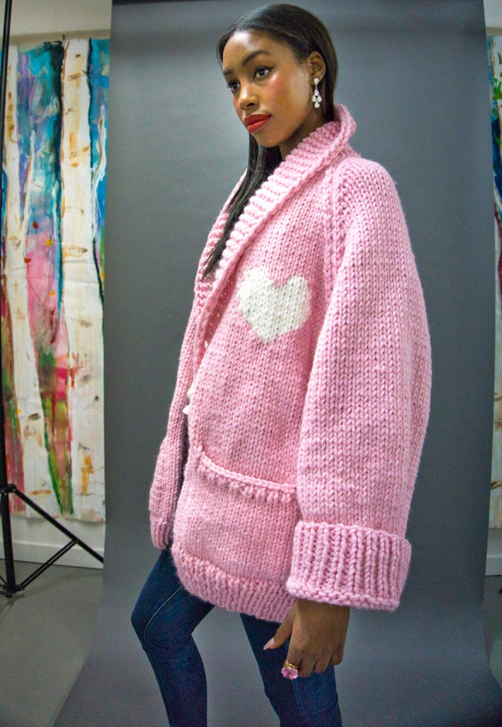 You will notice on the Short Jacket that the body and the arms are more exaggerated. The arms are wider and have a large folded cuff and the body is a-line. This sweater was designed to have the cuff worn rolled. This style is great for an effortless coat vibe and you want a pice you can layer over other pieces.