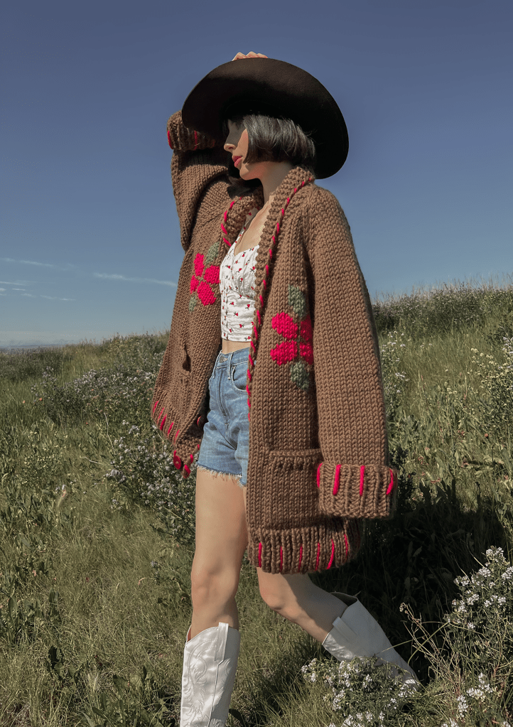 The Classic Long Cardi is a longer version of the short Cardi. We literally took the short Cardi and added 7″ to the bottom making the total length to 28″. This style is designed to cover your bottom. It is knit straight and will fit closer to the body. Same straight arms and cuff as we see on the short cardi.