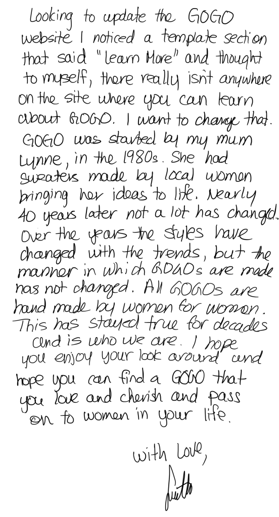 Please don’t machine wash your sweater. As much as we love the convenience of our washing machine and how far they have come, we ask that if needed please wash by hand. We suggest cold water and a bit of liquid detergent in a bath/sink, treat wool like you treat your hair, use your hands to gently massage and wash your GOGO. DO NOT LEAVE TO SOAK FOR HOURS AS THE COLOUR CAN TRANSFER. Immediately take out of the water and squeeze but do not ring. Lay flat on a dry towel and roll your sweater in the towel to remove excess water. We suggest the cinnamon bun method (think of a cinnamon bun log before it’s cut into individual buns). Once you have removed as much moisture out as possible, unroll and move to a new, dry towel and lay flat to dry. If spot treatment is needed please use a recommended spot remover for wool or cashmere. When you are not wearing your GOGO Sweater which we know is hard not to, store your sweater folded or laying flat, do not hang as we don’t want your favourite sweater to stretch out.